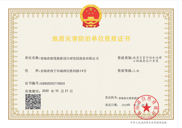 近日,公司獲得由青海省自然資源廳頒發(fā)的“地質(zhì)災(zāi)害評估和治理工程勘查設(shè)計(jì)資質(zhì)(乙級)”,標(biāo)志著公司在地質(zhì)災(zāi)害防治領(lǐng)域的業(yè)務(wù)能力和專業(yè)實(shí)力邁上新的臺階。